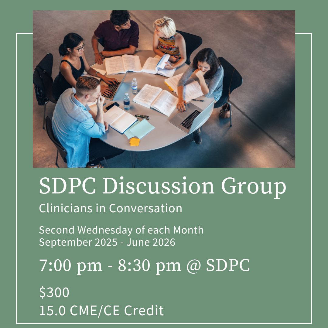 The 2025-26 Study Group is now called the Psychoanalytic Consultation Group. It will include case file discussions and peer consultation. There are a few remaining spots open. First-come, first-served. For more information, contact: programs@sdpsychoanalytic.org.